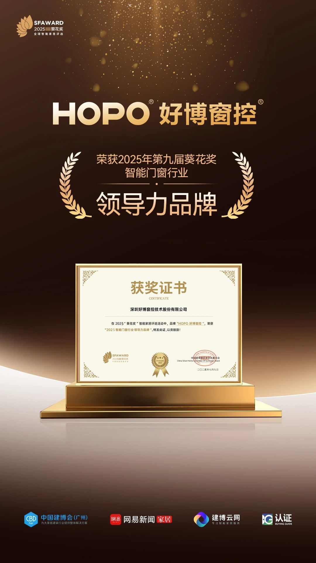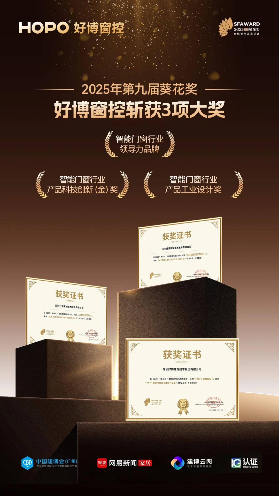 在备受瞩目的评选中,GD好博好博窗控一举斩获“葵花奖”三项重量级大奖: